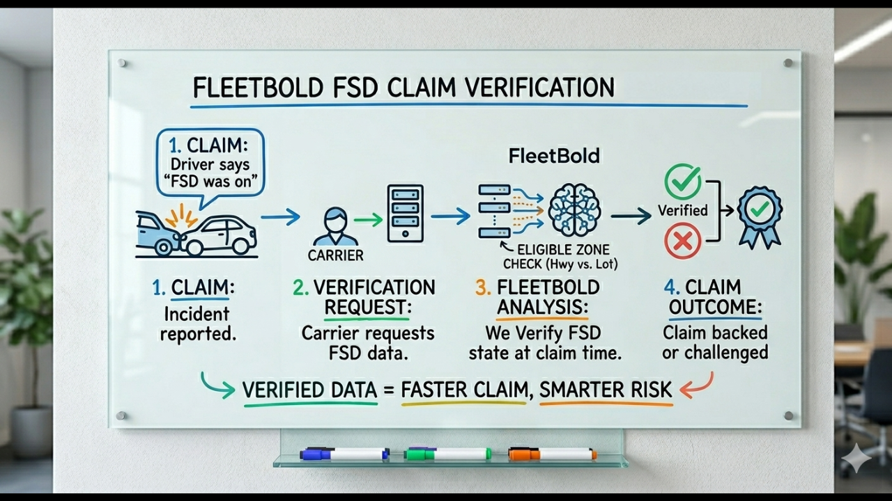 No. FleetBold does not determine legal fault or liability. FleetBold provides technical trip data and FSD usage context that can support claims review, accident analysis, customer disputes, and internal investigations.