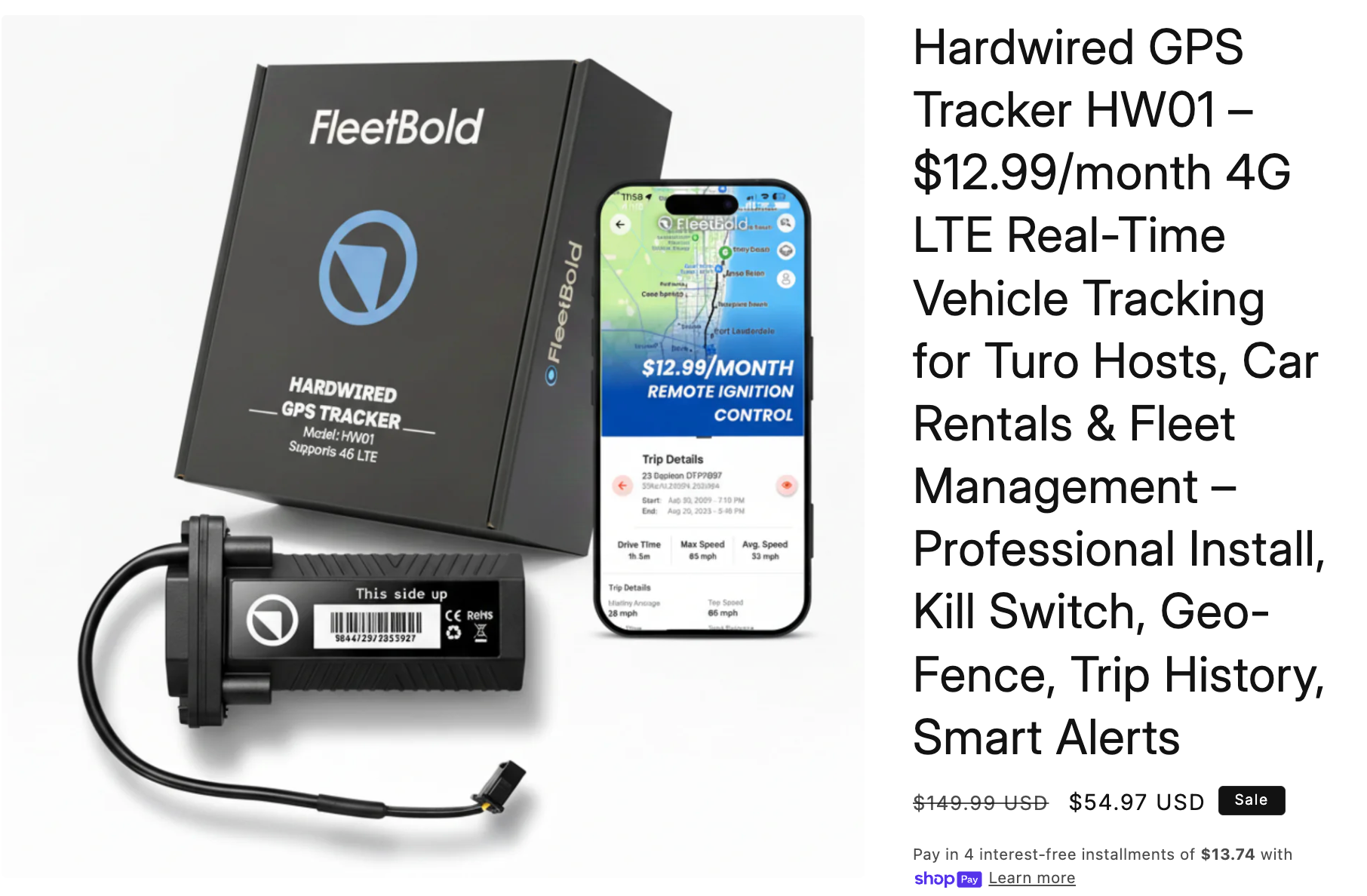 The FleetBold HW01 is a waterproof 4G LTE hardwired GPS tracker with 7-second updates, global coverage, backup battery, and remote ignition control. Ideal for Turo hosts, car rentals, and fleets needing reliable real-time tracking.